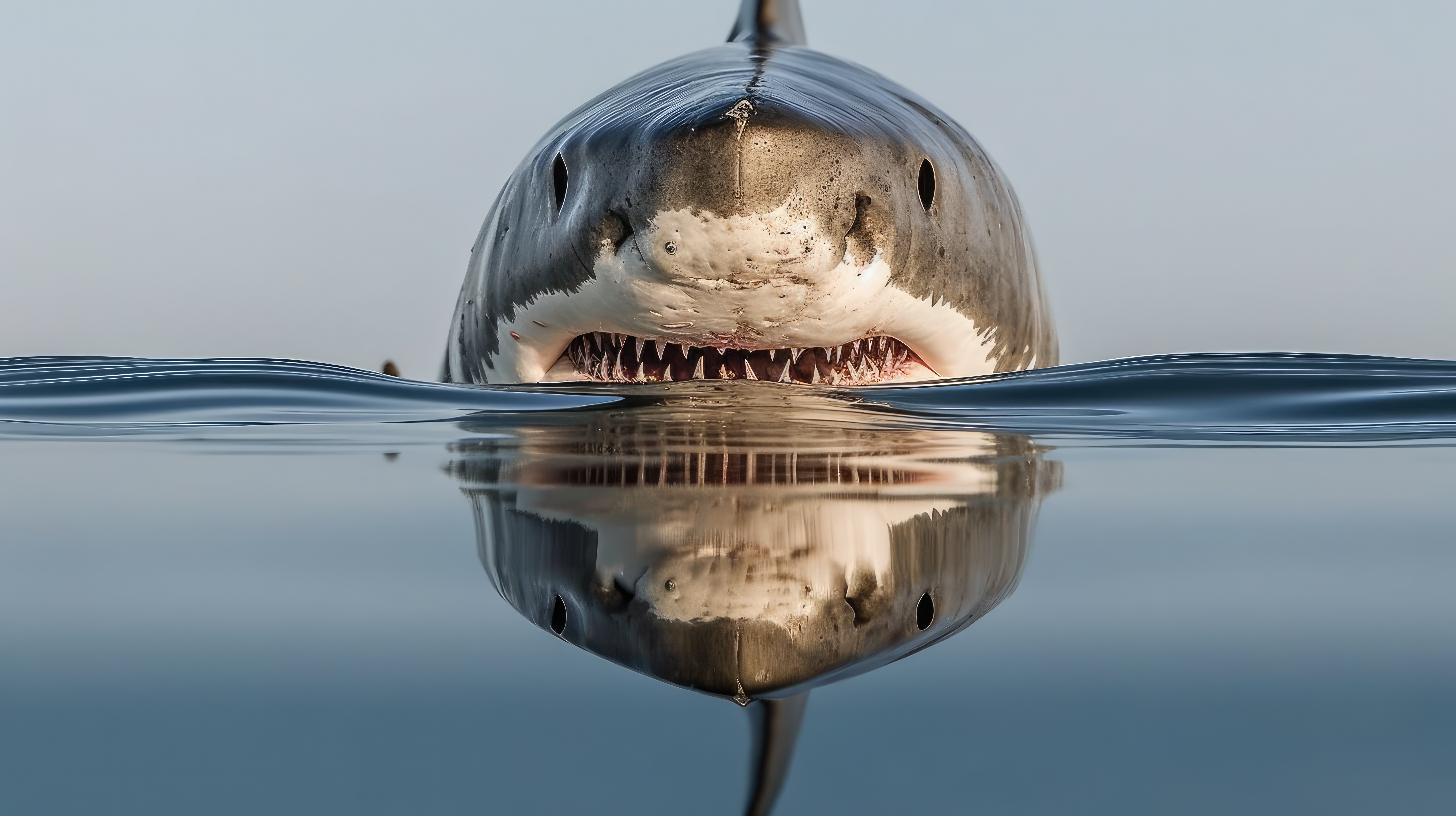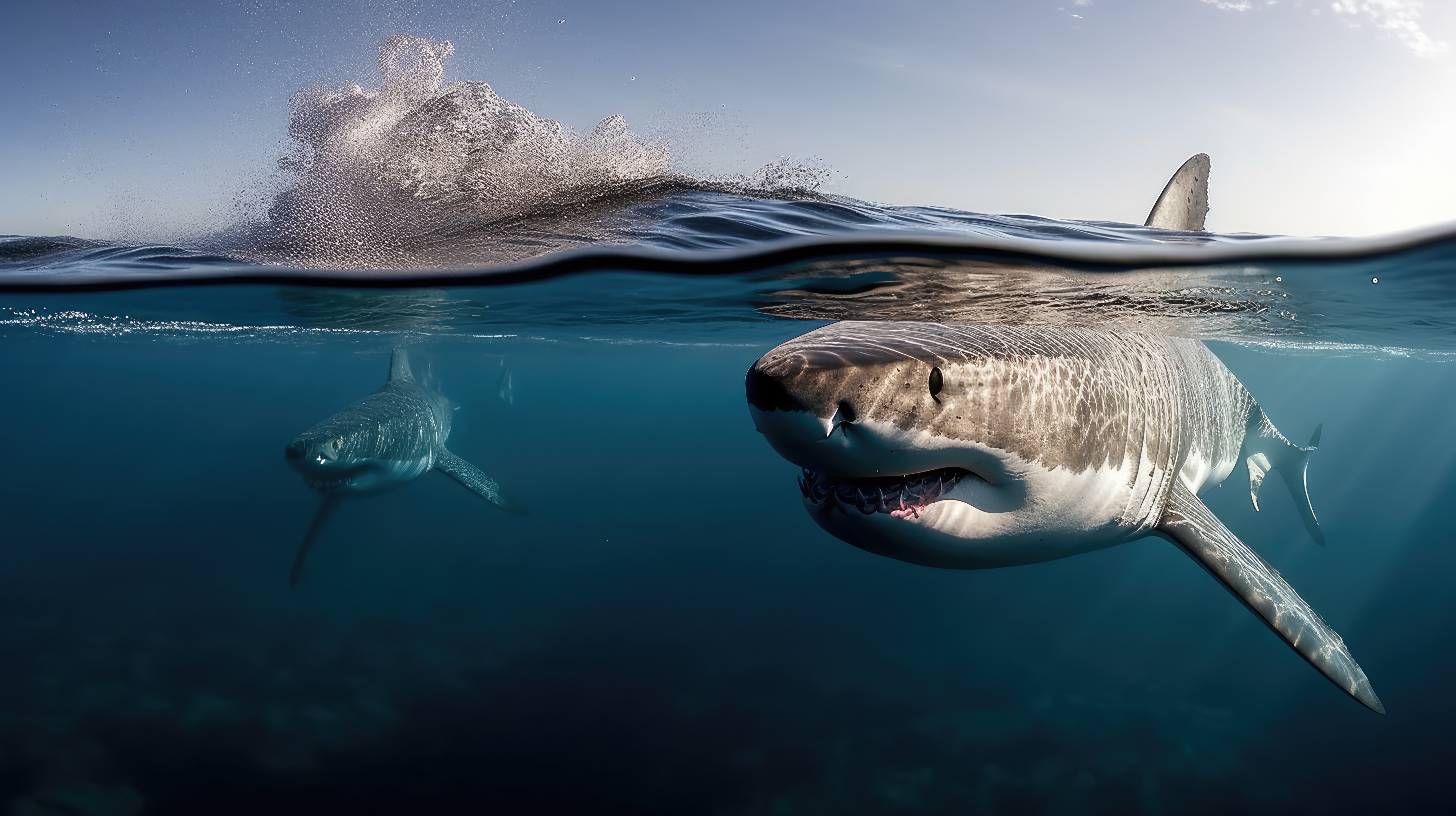Prompt: A great white shark, split view with half of the image above water and half below –ar 16:9 –v 5