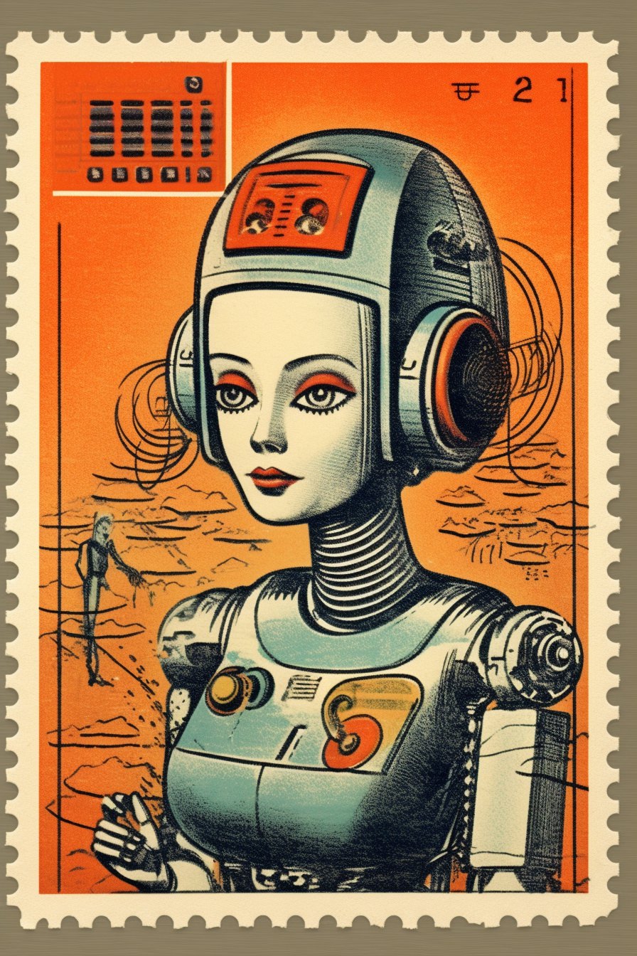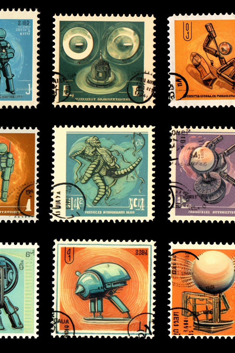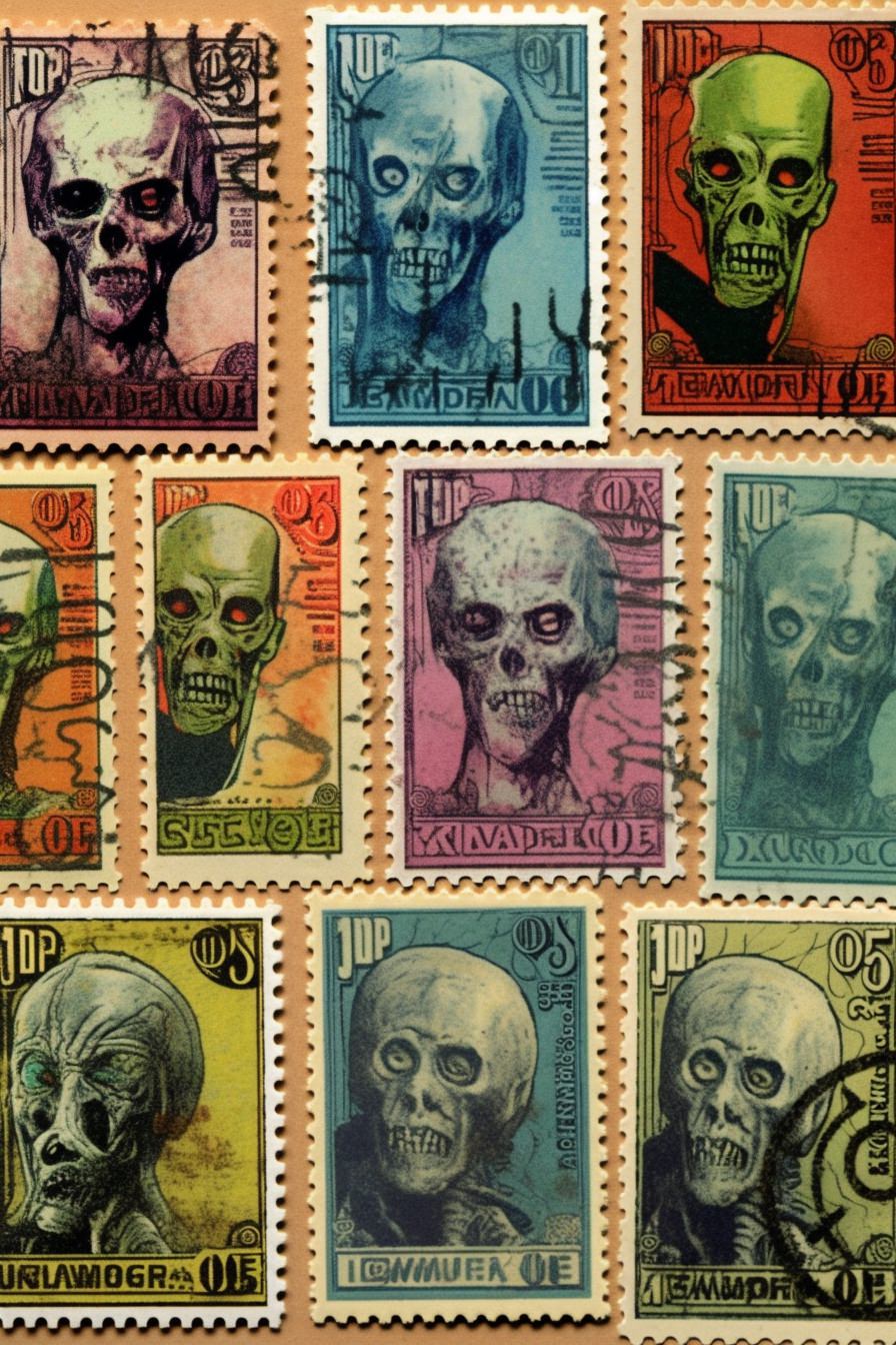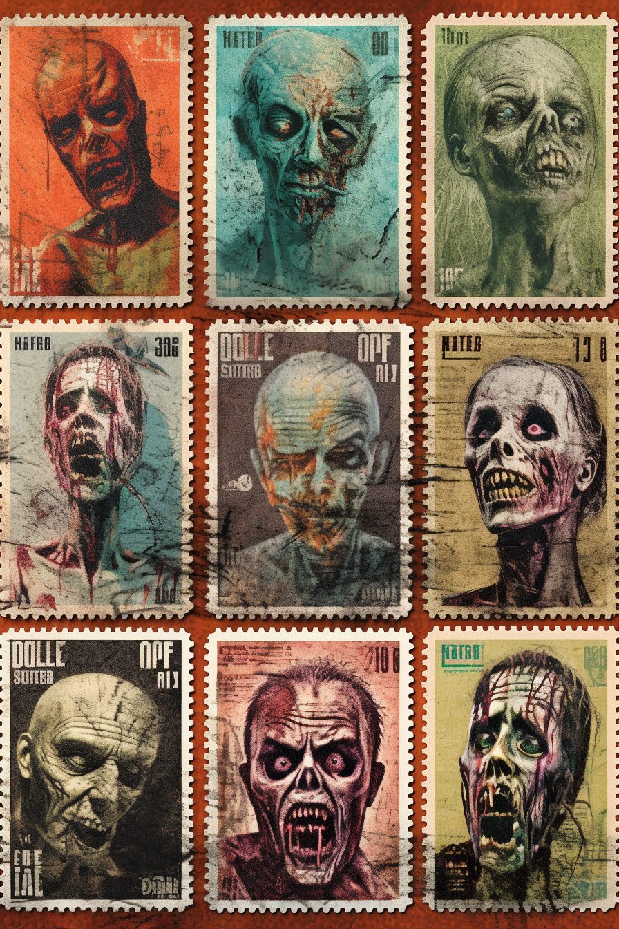 Postage stamps, retro art, vintage horror movie poster, zombies --ar 2:3 --style raw