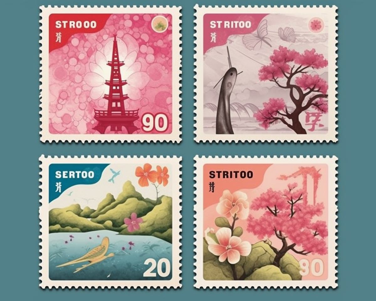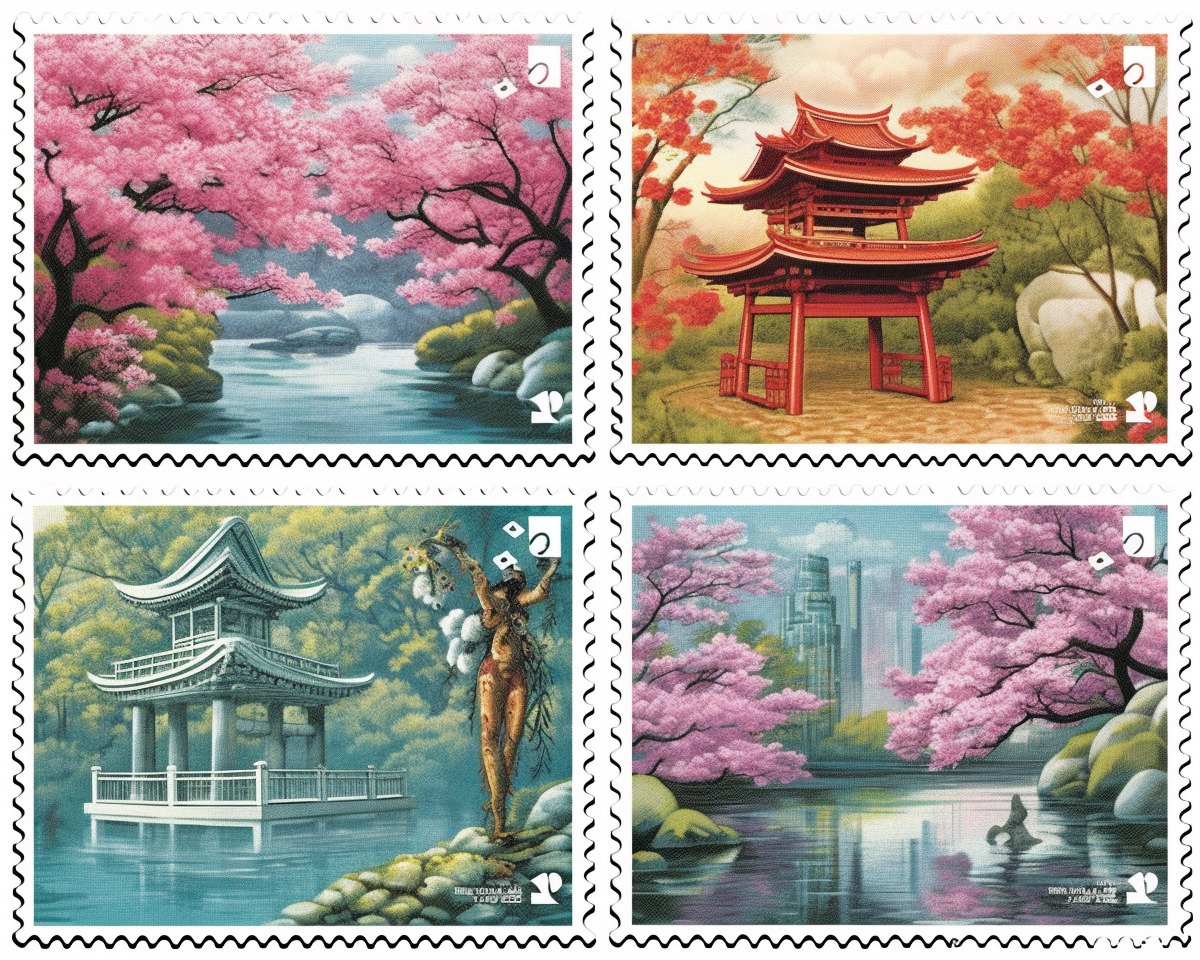 Postage Stamps: Surreal Kyoto: Create a series of postage stamps portraying Kyoto, Japan, in a surreal art style. Each stamp could feature a different traditional Japanese garden or temple, but with unexpected and fantastical elements incorporated. For instance, cherry blossom trees could bloom with multi-colored petals, and koi fish could transform into celestial beings. The stamps would evoke a sense of wonder and contemplation, capturing the mystique and tranquility of Kyoto --s 750 --q 2 --ar 5:4 --v 5.1