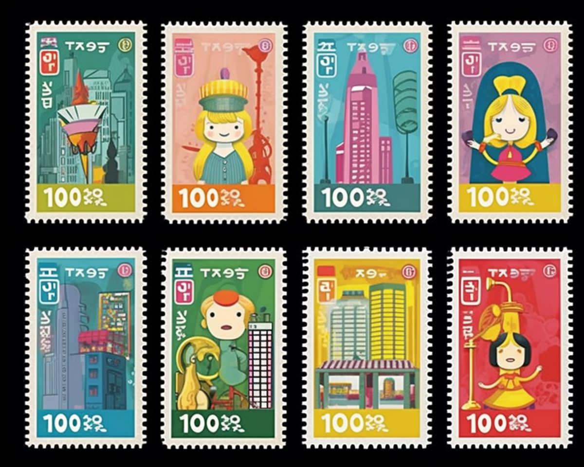 Postage Stamps: Whimsical Tokyo: Design a set of postage stamps showcasing Tokyo in an imaginative and playful art style. Each stamp could highlight a different aspect of the city's culture, such as its vibrant street fashion, bustling cityscape, or traditional gardens. The artwork could incorporate elements of Japanese manga or anime, with exaggerated characters and vibrant colors. The stamps could also incorporate whimsical elements like floating lanterns or mythical creatures, adding an element of fantasy and enchantment --s 750 --q 2 --ar 5:4 --v 5.1