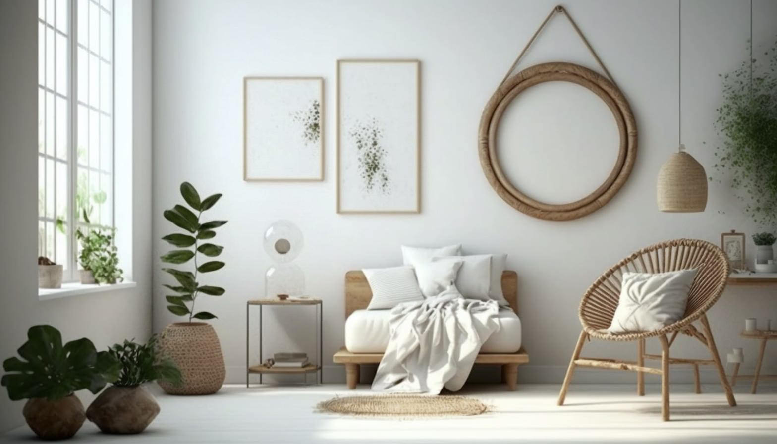 Prompt: A white room with natural wooden furniture, Scandi - Boho style, photorealistic interior design, natural lighting, empty blank white frame on the wall –ar 16:9 –v 4