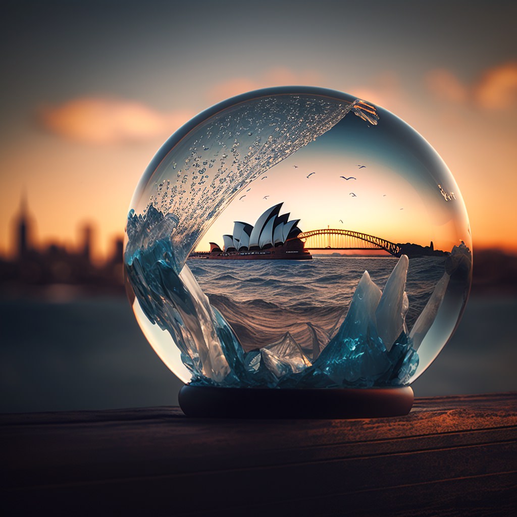 Snowglobe, Sydney Opera House in background, sunlight, sunset, cinematic