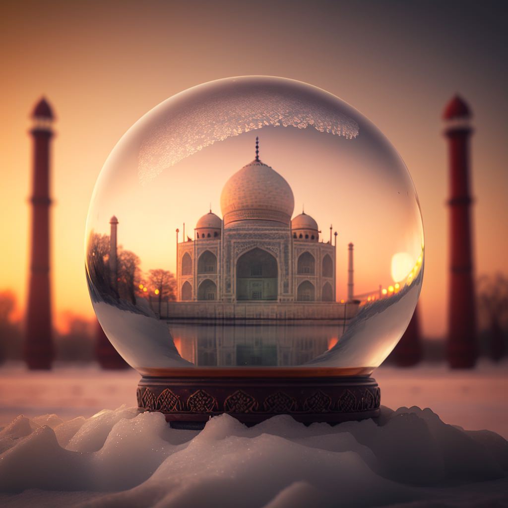 Snowglobe, Taj Mahal in background, sunlight, sunset, cinematic