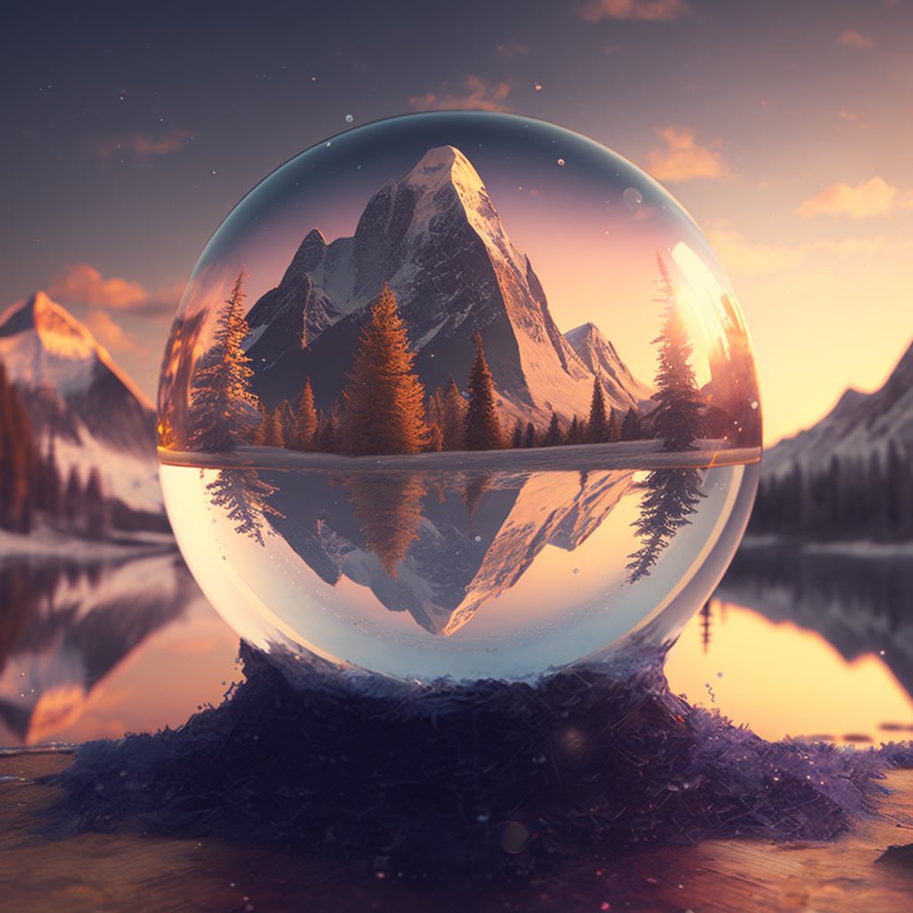 Snowglobe, nature, water in background, mountains, trees, sunlight, sunset, cinematic