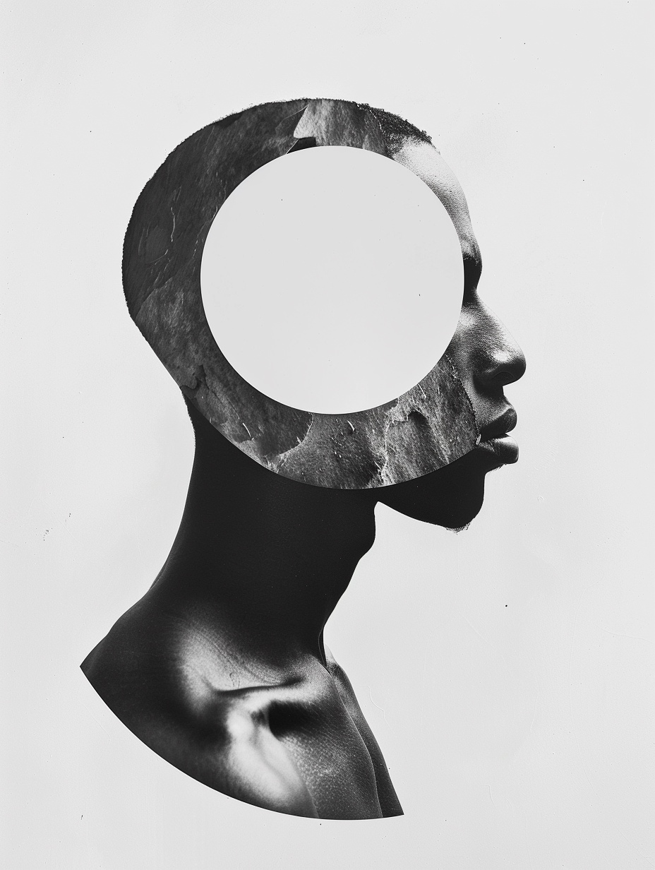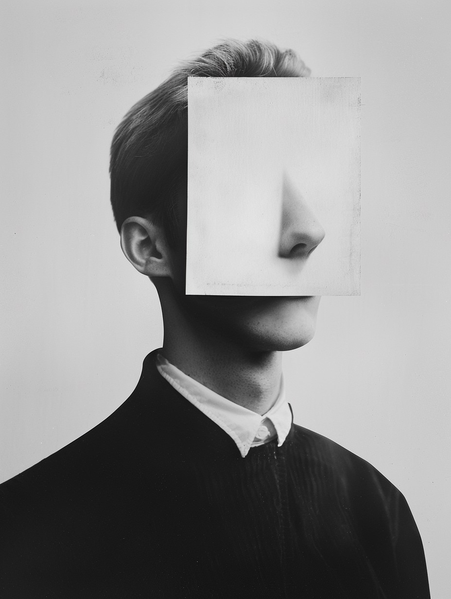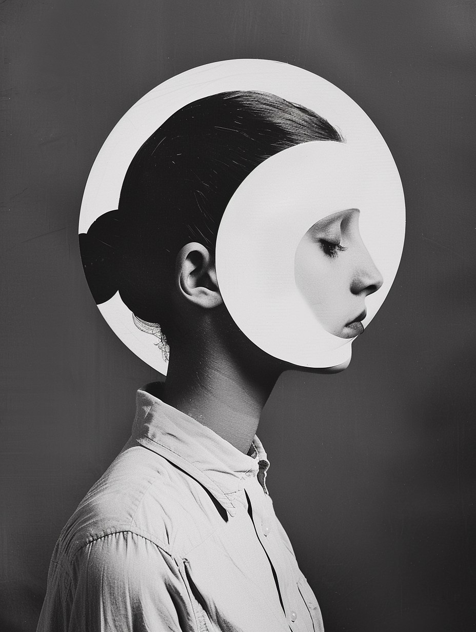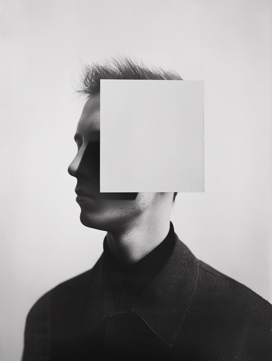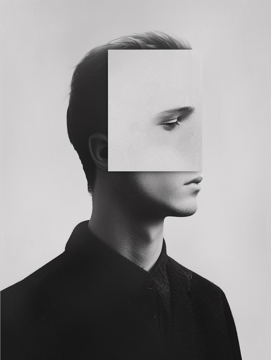 minimalist surreal collage of [asian/black/caucasian] [male/female] with white [square/circular/triangular/...] cut out face, negative space, black and white, --ar 3:4