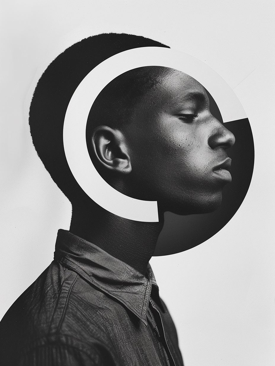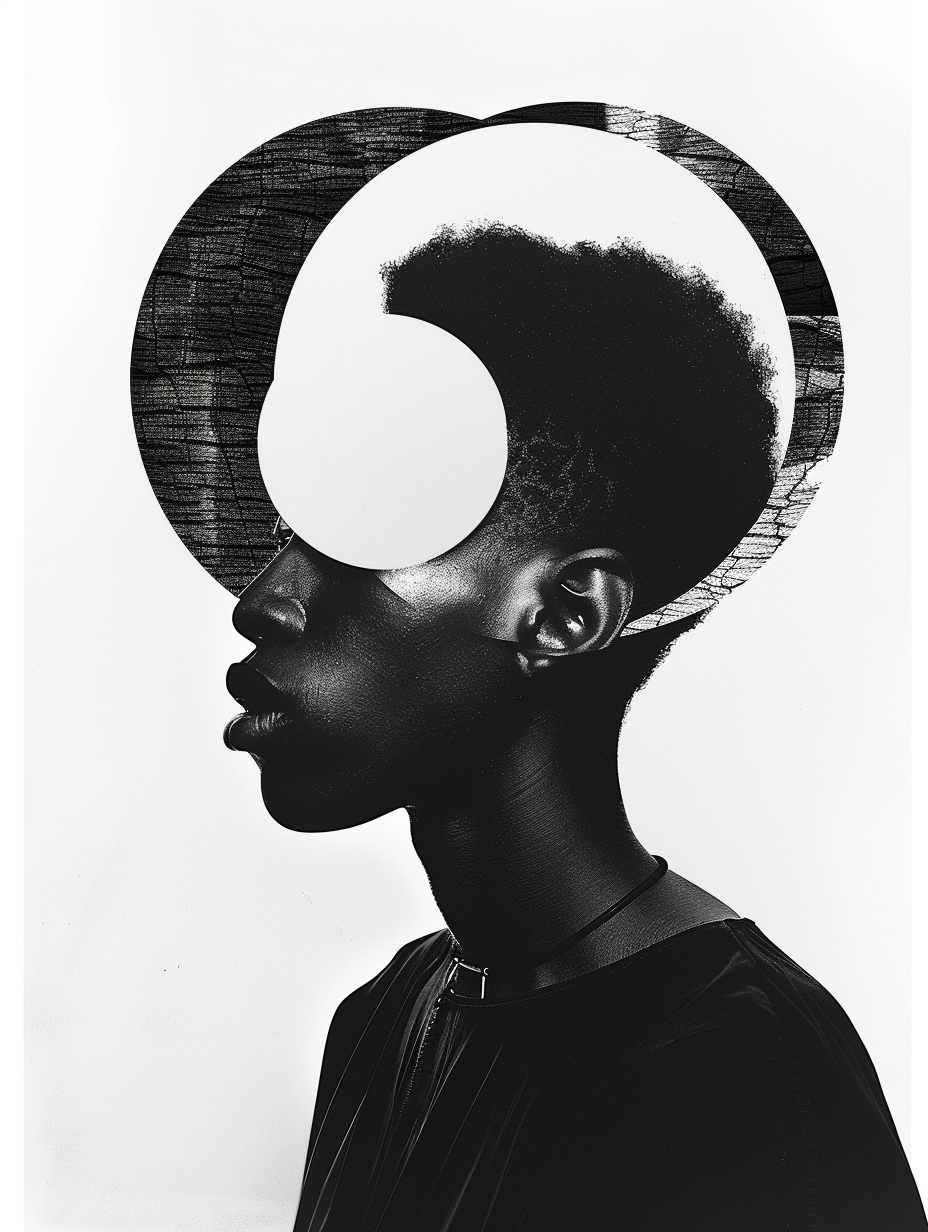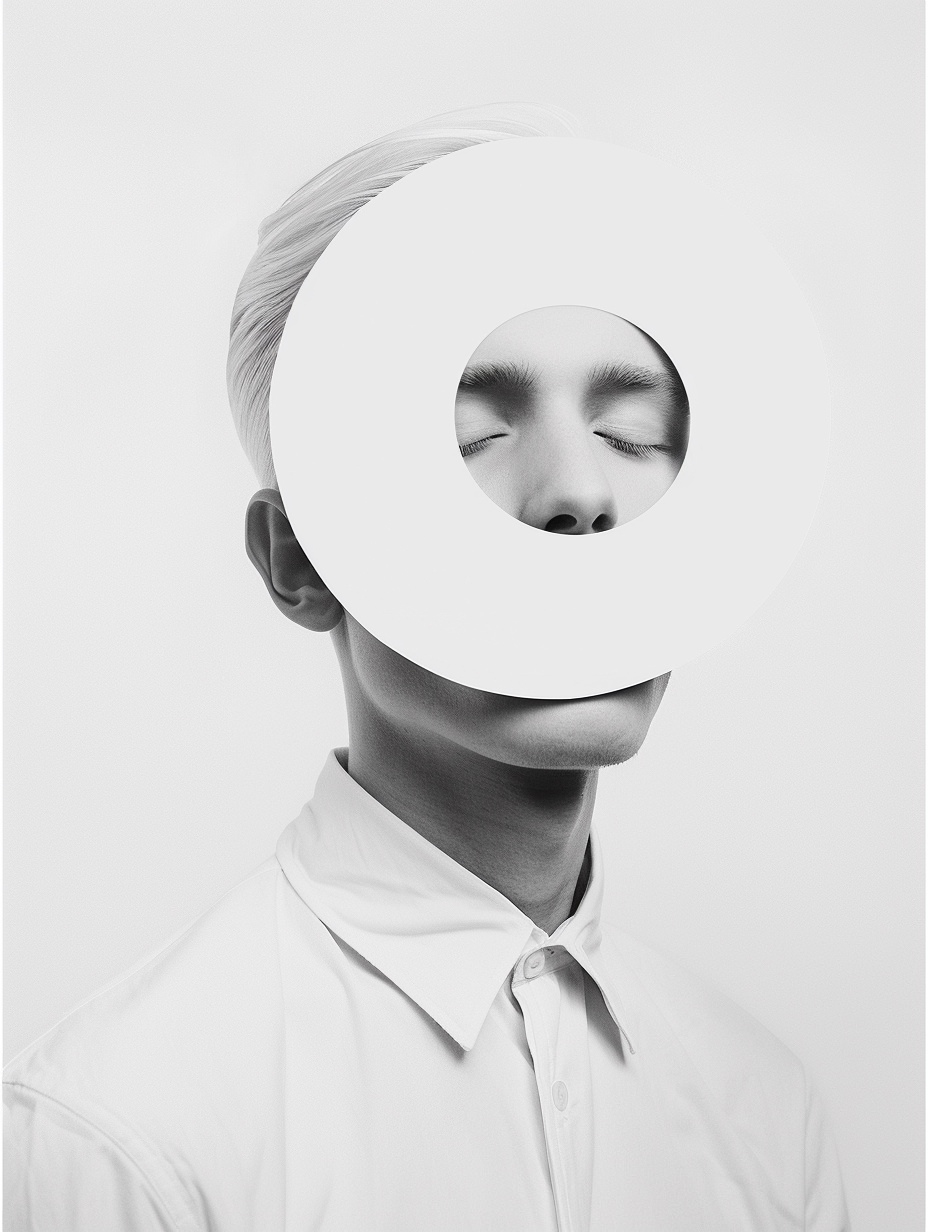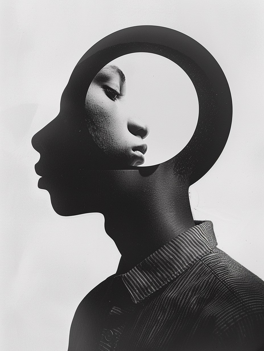 minimalist surreal collage of [asian/black/caucasian] [male/female] with white [square/circular/triangular/...] cut out face, negative space, black and white, --ar 3:4
