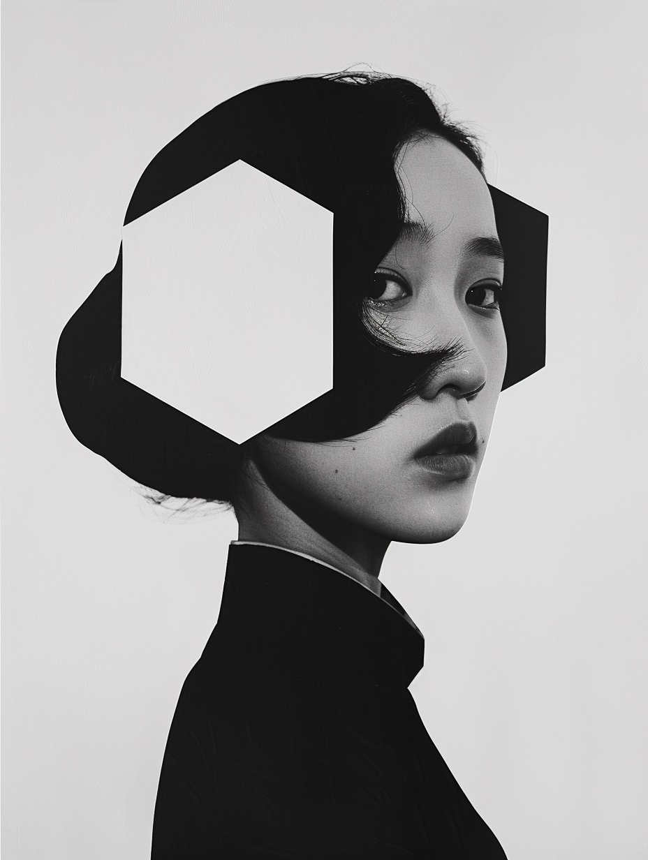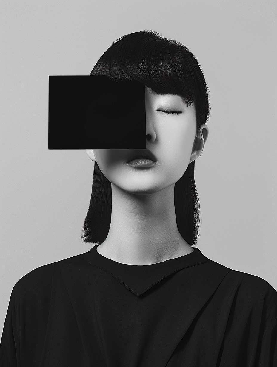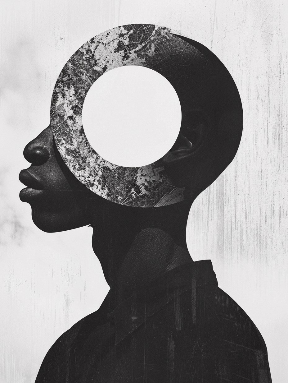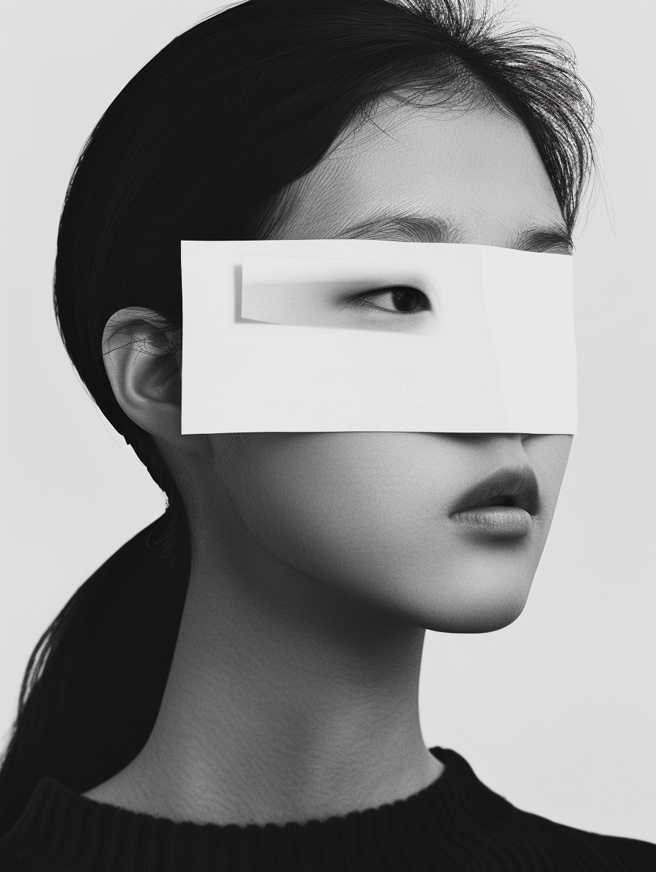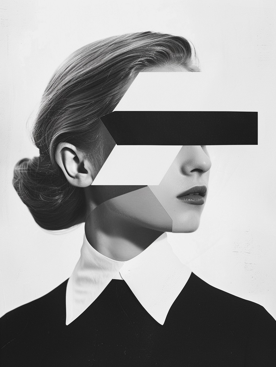 minimalist surreal collage of [asian/black/caucasian] [male/female] with white [square/circular/triangular/...] cut out face, negative space, black and white, --ar 3:4