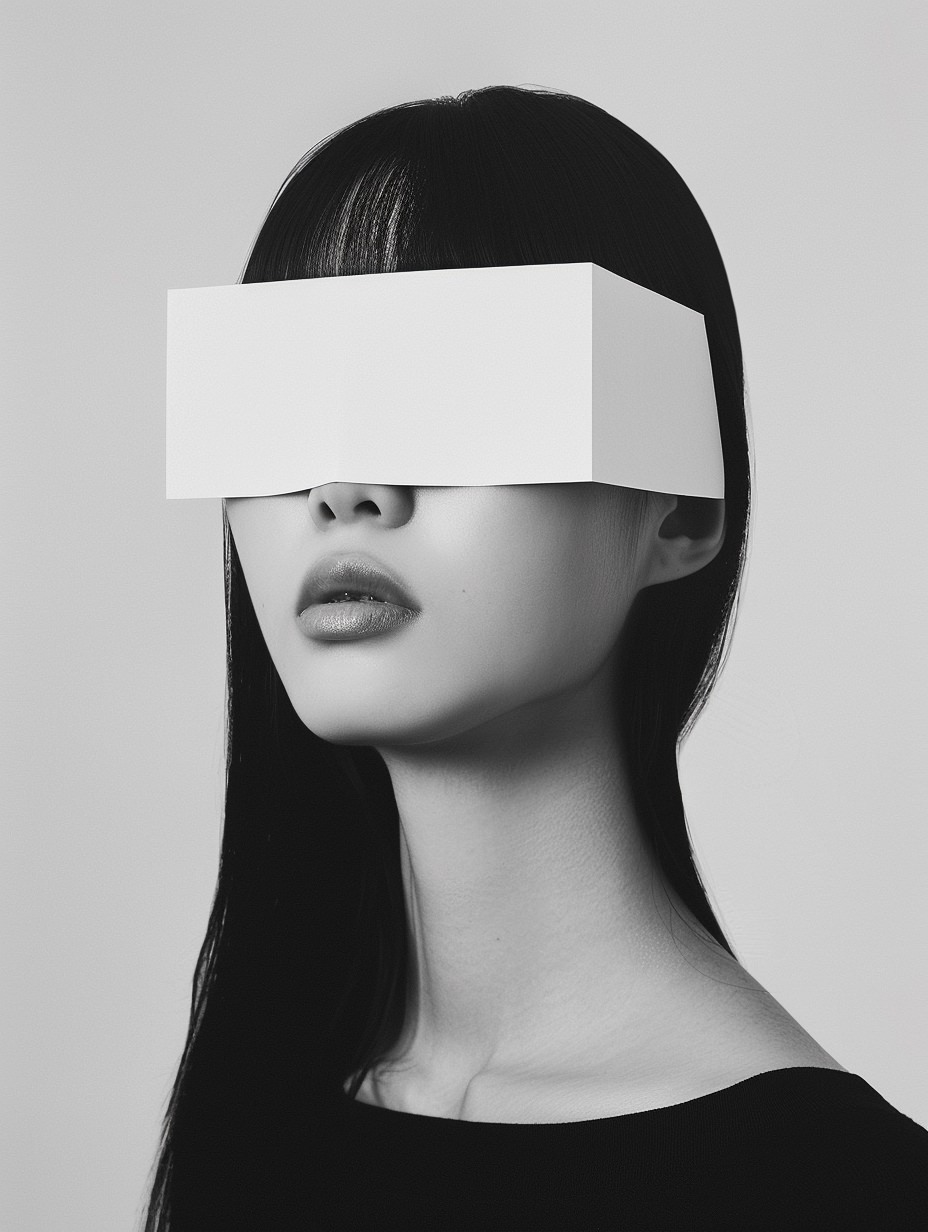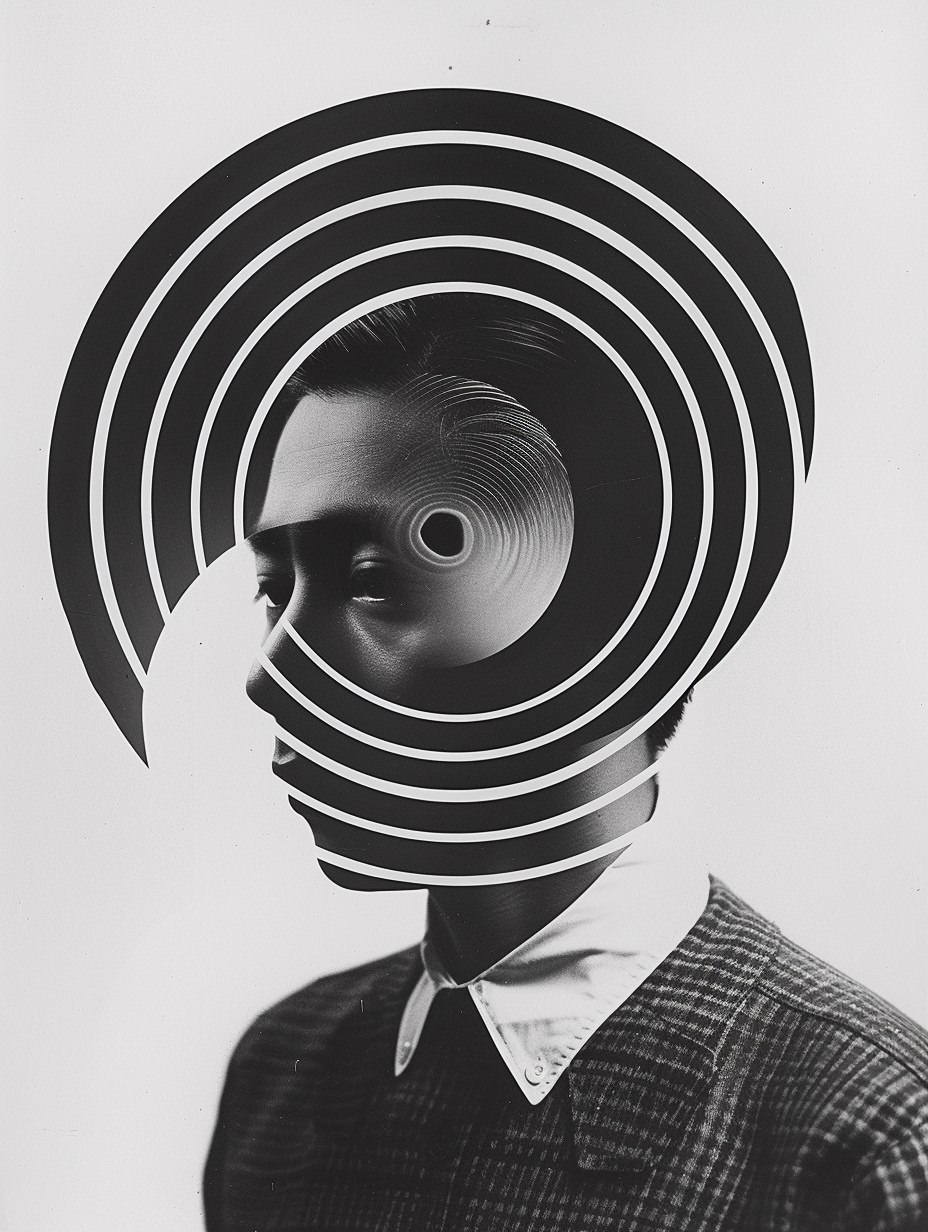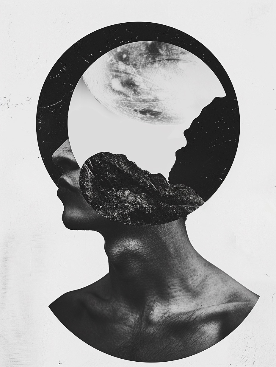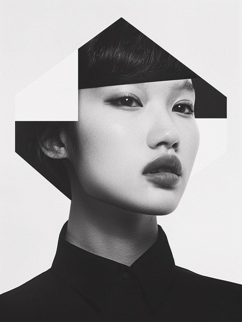 minimalist surreal collage of [asian/black/caucasian] [male/female] with white [square/circular/triangular/...] cut out face, negative space, black and white, --ar 3:4