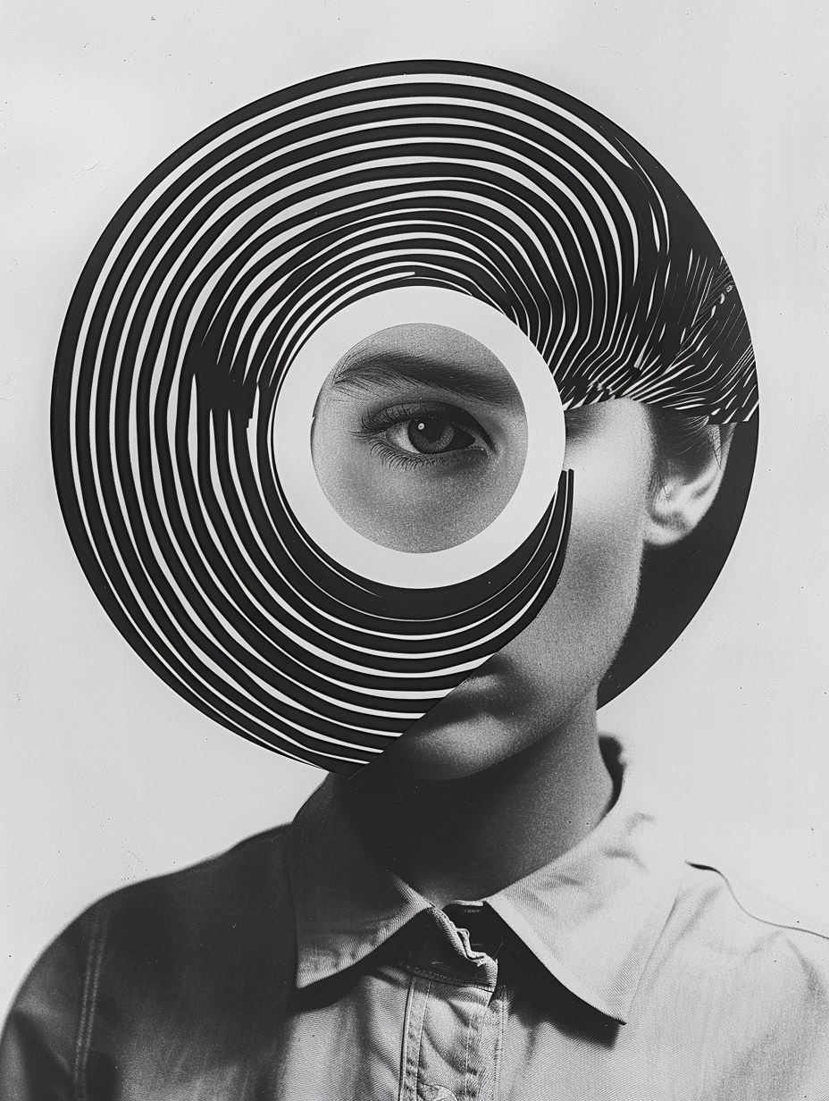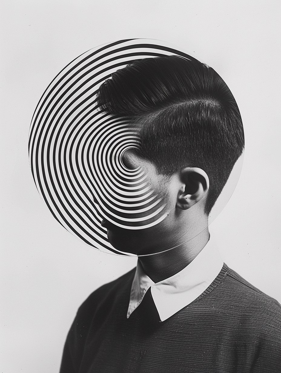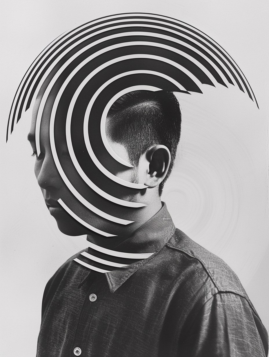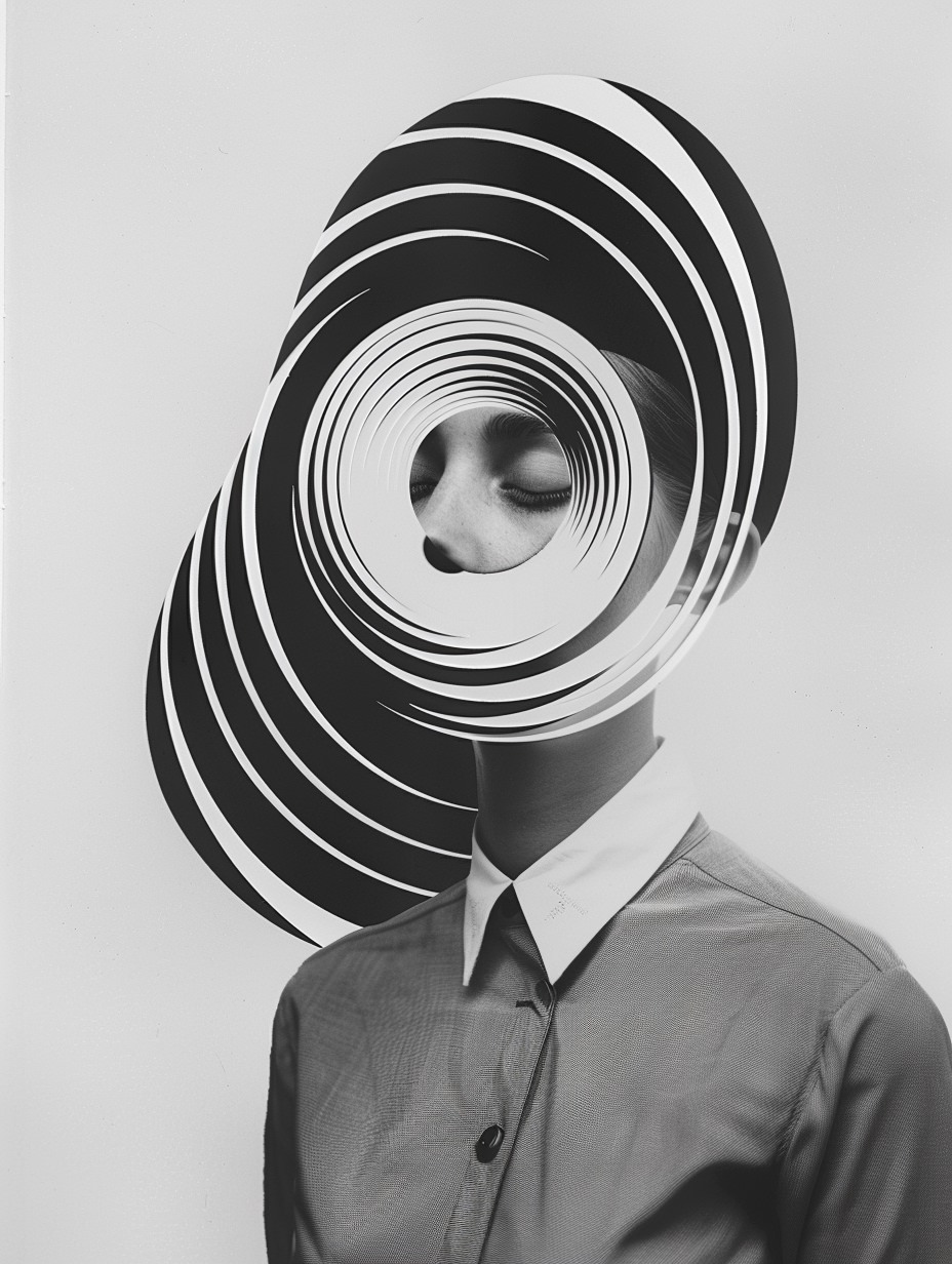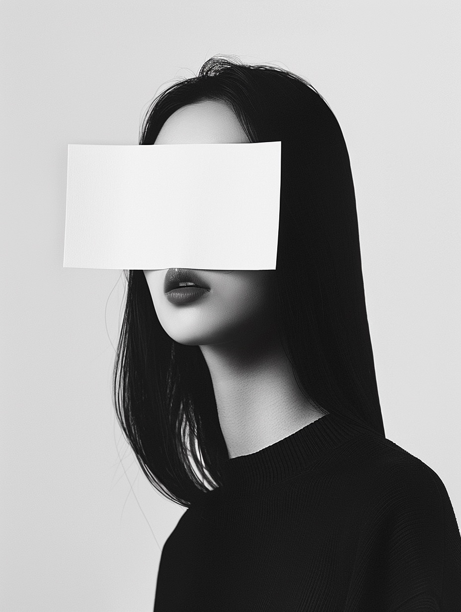 minimalist surreal collage of [asian/black/caucasian] [male/female] with white [square/circular/triangular/...] cut out face, negative space, black and white, --ar 3:4