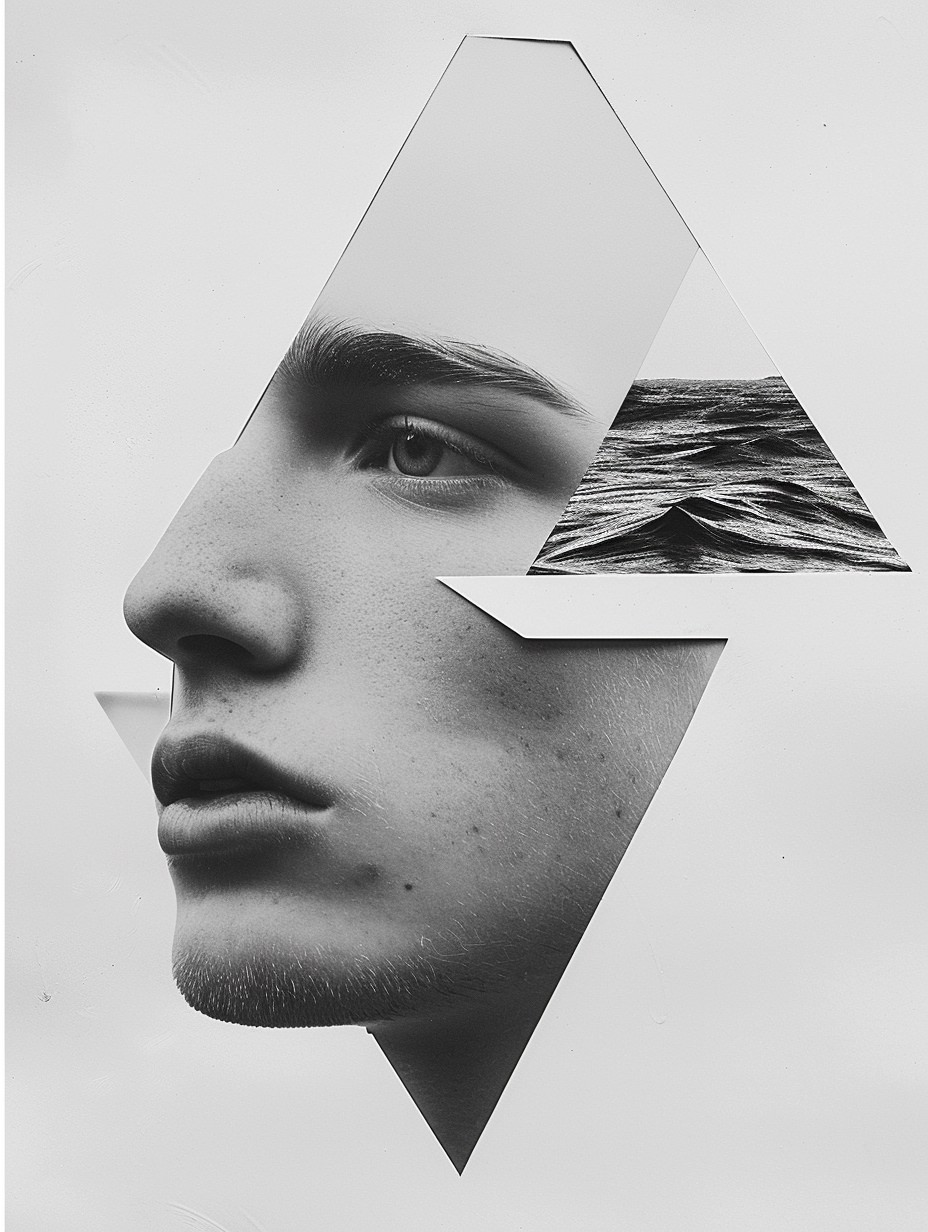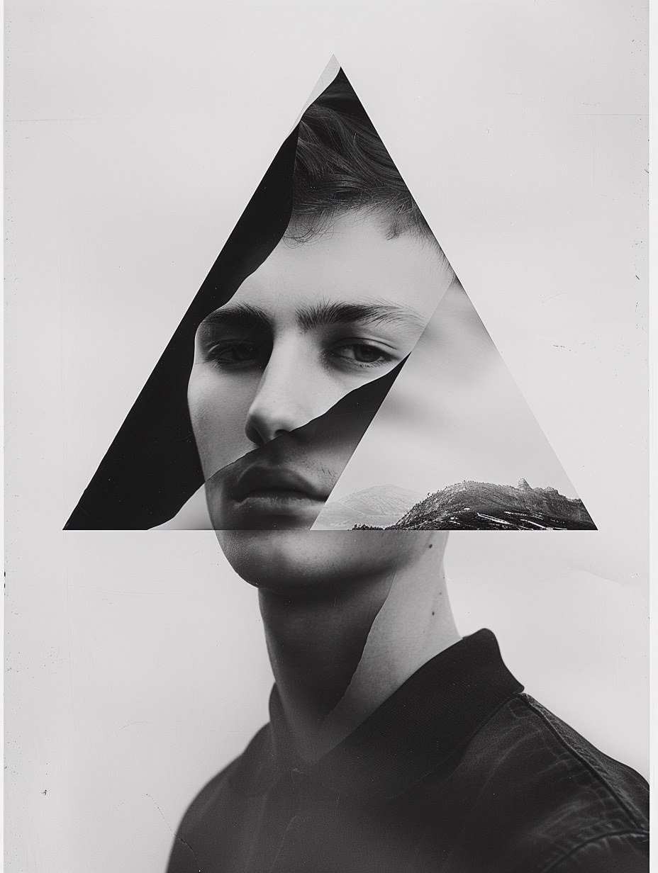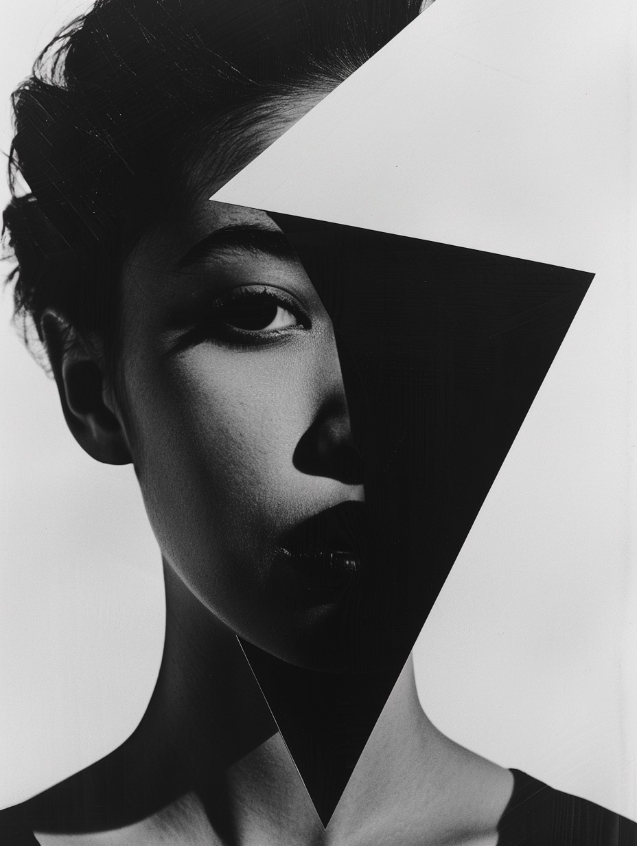 Surreal and minimalist portraiture, characterized by the integration of geometric shapes within human forms, in black and white to emphasize contrast and focus on the interplay of shapes and human features, creating a visually arresting and thought-provoking effect.