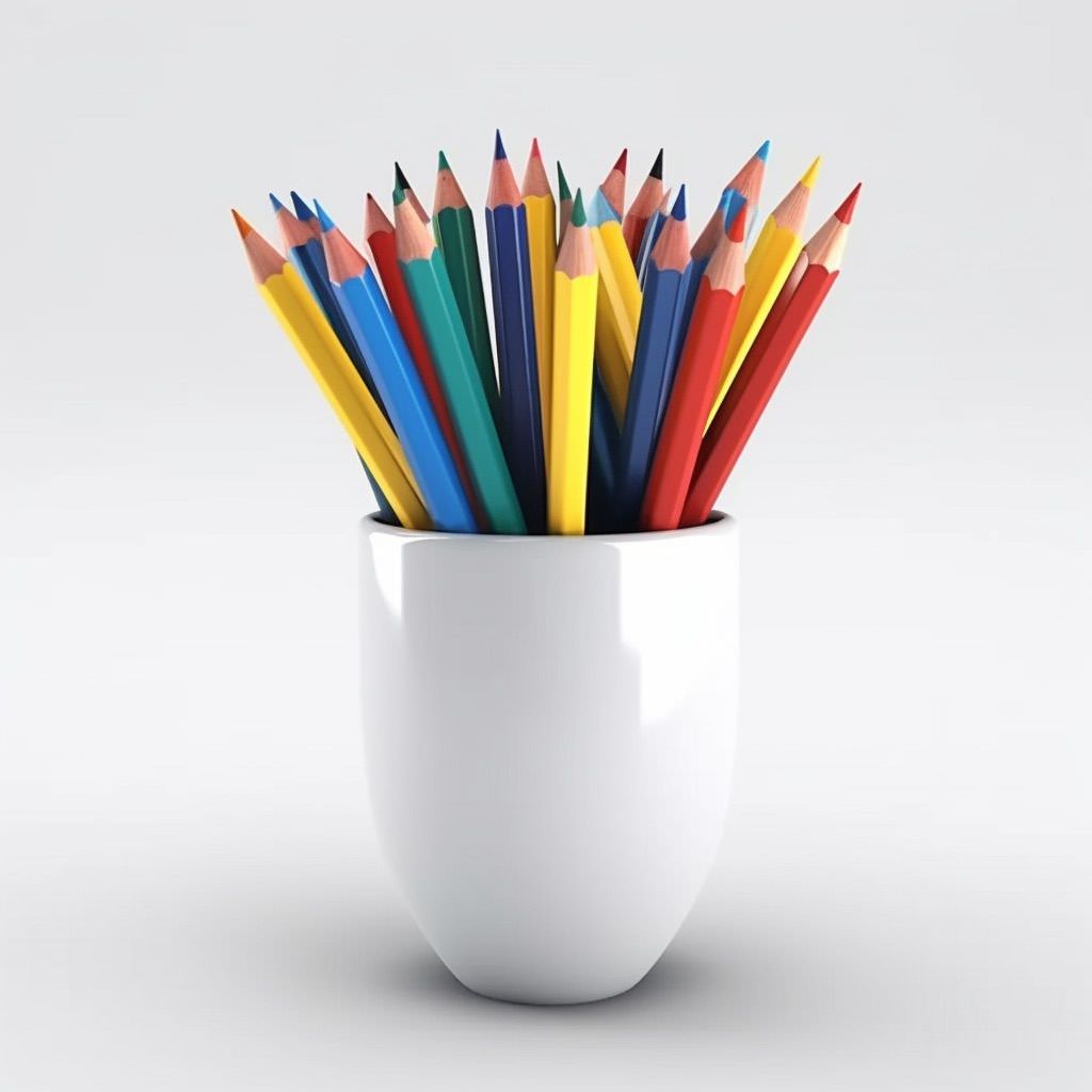 cup of colorful pens on white background, an icon, isometric 45 degree rotation, solid white background, realistic, a 3D render, a 3D rendering, very slight shadow, plastic, claymation, plastic, simple graphic, minimalist, minimalism, soft light overhead, polycount, photorealism, rendered in maya, rendered in cinema4d, rendered in blender, rendered in aztec, physically based rendering, Diffraction Grading, Chromatic Aberration, GB Displacement, Scan Lines, Ray Traced, Ray Tracing Ambient Occlusion, Anti-Aliasing, FXAA, TXAA, RTX, SSAO, Shaders, OpenGL - Shaders, GLSL - Shaders,Post Processing, Post-Production, Cel Shading, Tone Mapping --v 5 --c 8 --s 800
